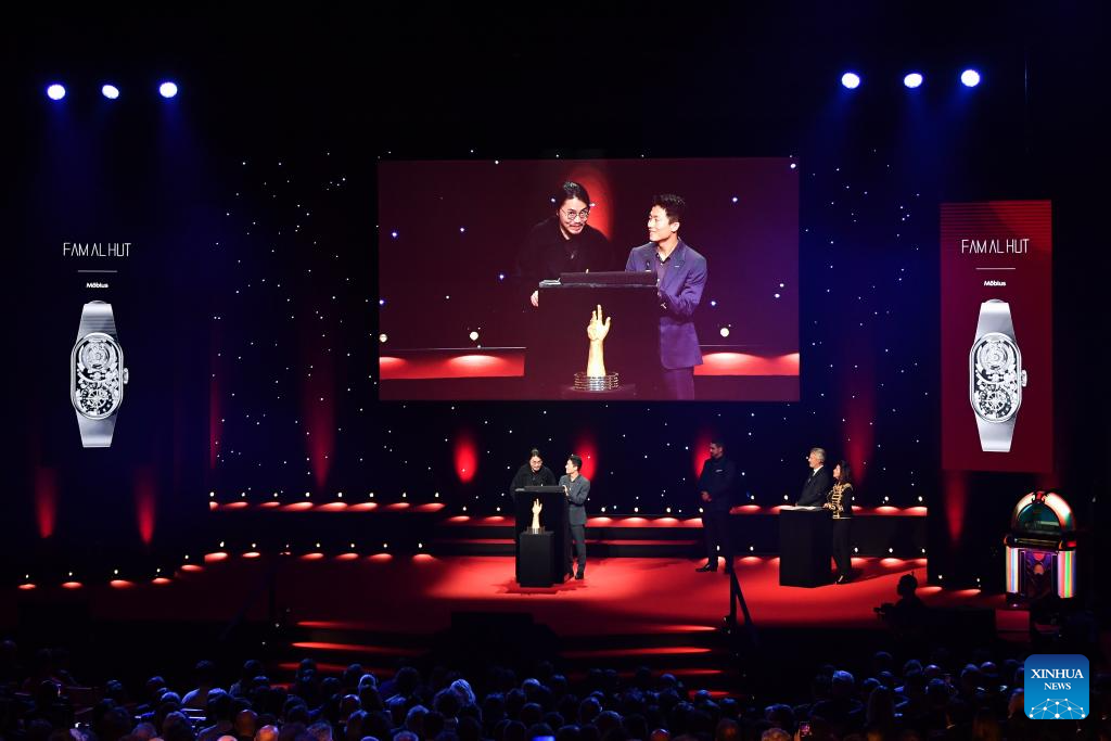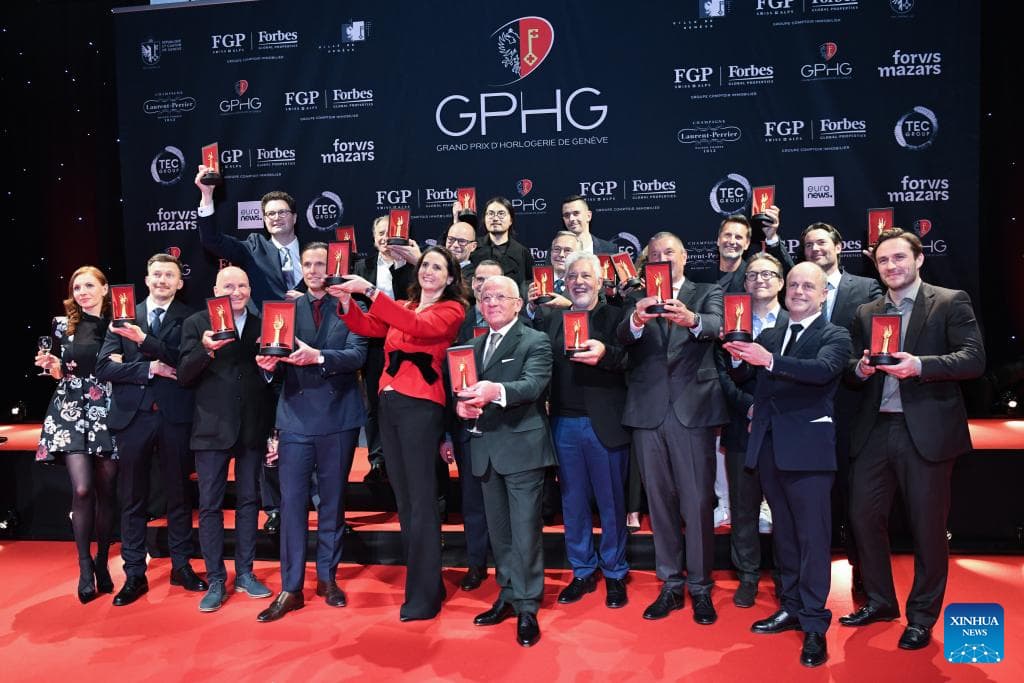 Imagen del 13 de noviembre de 2025 de Dai Xinyan (c-atrás), fundador de Fam al Hut, asistiendo a la ceremonia de premiación del 25 Gran Premio de Relojería de Ginebra (GPHG, por sus siglas en francés), en Ginebra, Suiza. La marca china independiente de relojes Fam al Hut ganó el jueves el Premio Audacity en el 25 GPHG, considerado por muchos como los "Oscar de la Relojería". Esta es la segunda vez que una marca china ha obtenido un premio GPHG. En 2021, la empresa china CIGA Design ganó el Premio Challenge Watch por su modelo original, "el Planeta Azul". (Xinhua/Lian Yi)