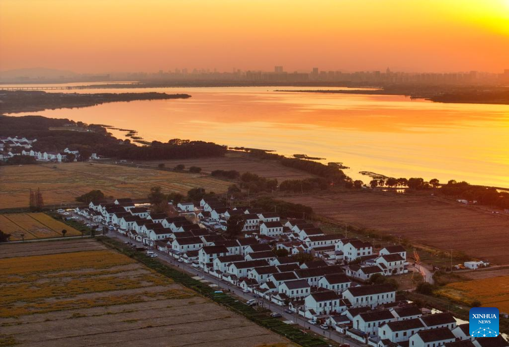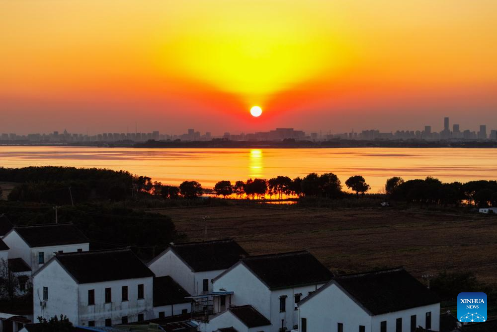 Vista aérea tomada con un dron el 13 de noviembre de 2025 de la puesta de sol del lago Yangcheng, en Suzhou, en la provincia de Jiangsu, en el este de China. (Xinhua/Ji Chunpeng)