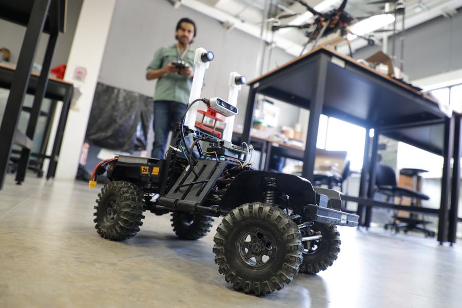 Imagen del 19 de noviembre de 2025 del doctor, Rodolfo Vera Amaro, de la Unidad Profesional Interdisciplinaria en Ingeniería y Tecnologías Avanzadas del Instituto Politécnico Nacional (IPN) de México, realizando pruebas con un vehículo robótico (rover), en la Ciudad de México, capital de México. (Xinhua/Francisco Cañedo)
