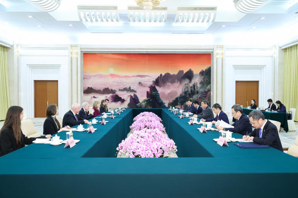 El vice primer ministro chino, He Lifeng, también miembro del Buró Político del Comité Central del Partido Comunista de China (PCCh), se reúne con Stephen Hadley, exasesor de seguridad nacional del presidente de Estados Unidos y vicepresidente ejecutivo del Atlantic Council, en el Gran Palacio del Pueblo, en Beijing, capital de China, el 21 de noviembre de 2025. (Xinhua/Liu Bin)