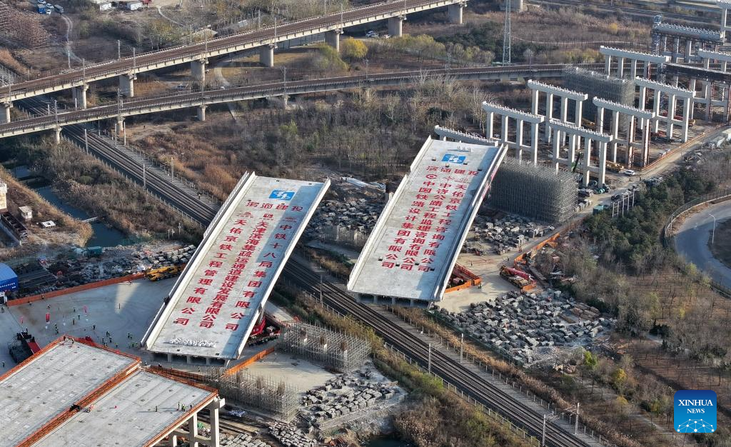 TIANJIN, 26 noviembre, 2025 (Xinhua) -- Vista aérea tomada con un dron el 26 de noviembre de 2025 del sitio de construcción de los puentes giratorios gemelos de la autopista Xinggang, en Tianjin, en el norte de China. Los puentes giratorios gemelos de la autopista Xinggang completaron su rotación aquí el miércoles. Dos vigas continuas, cada una con un peso de 14.000 toneladas, giraron simultáneamente en el sentido de las agujas del reloj por más de 60 grados para pasar sobre una vía férrea. (Xinhua/Li Ran)