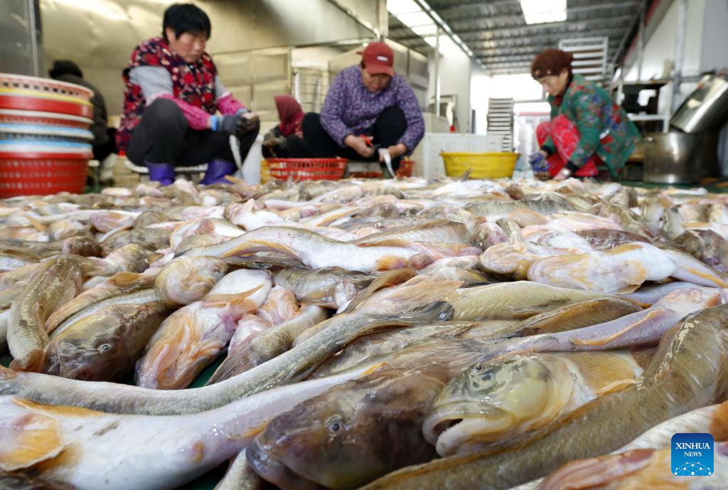 Pescadores chinos aprovechan buen clima para procesar pescado y mariscos