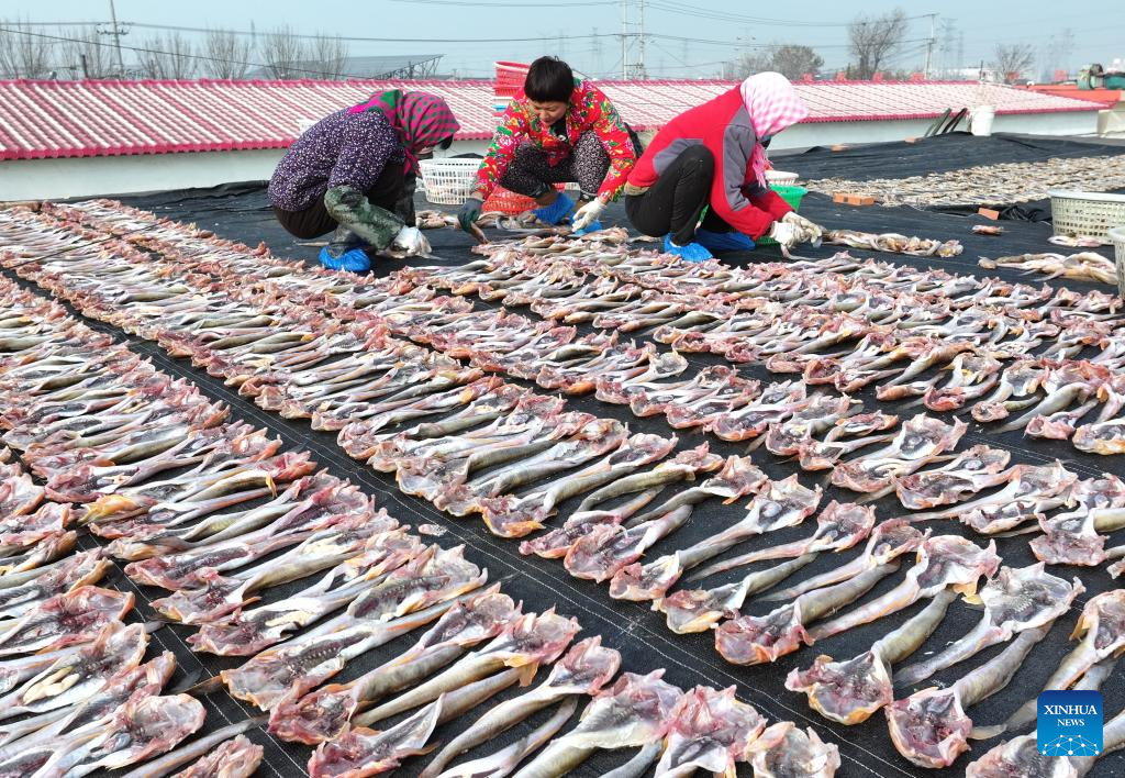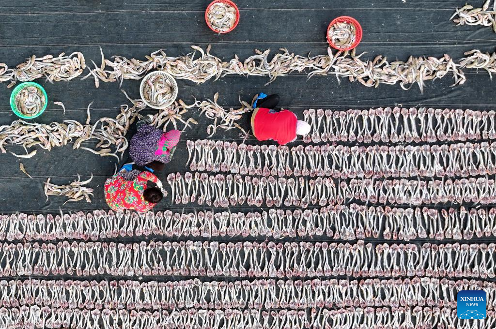 SHIJIAZHUANG, 1 diciembre, 2025 (Xinhua) -- Imagen del 30 de noviembre de 2025 de aldeanos procesando pescado, en el poblado de Heiyanzi, en el distrito de Fengnan de la ciudad de Tangshan, en la provincia de Hebei, en el norte de China. Los pescadores aprovechan el buen clima para procesar y secar pescado, camarones y otros mariscos para abastecer el mercado. (Xinhua/Yang Shiyao)