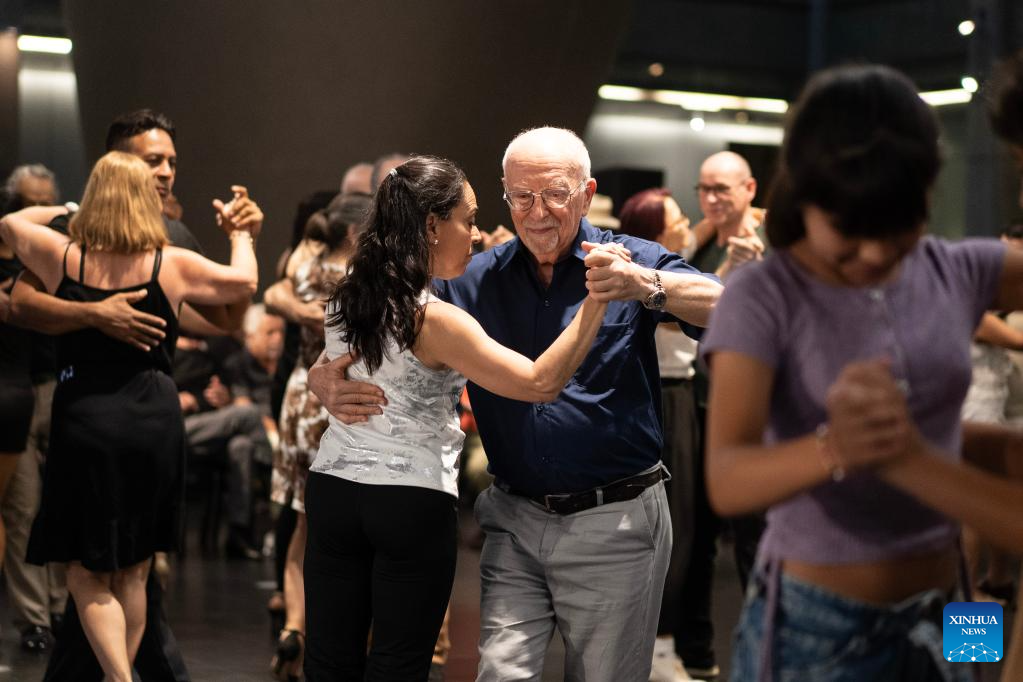 Imagen del 11 de diciembre de 2025 de parejas bailando tango durante una clase en el marco del Día Nacional del Tango en el Centro Cultural Palacio Libertad, en la ciudad de Buenos Aires, capital de Argentina. Argentina celebró el jueves el Día Nacional del Tango, una fecha establecida para recordar los nacimientos de Carlos Gardel y Julio de Caro, dos de los máximos exponentes de la cultura popular y referentes fundamentales de la música y la danza del país sudamericano. (Xinhua/Martín Zabala)