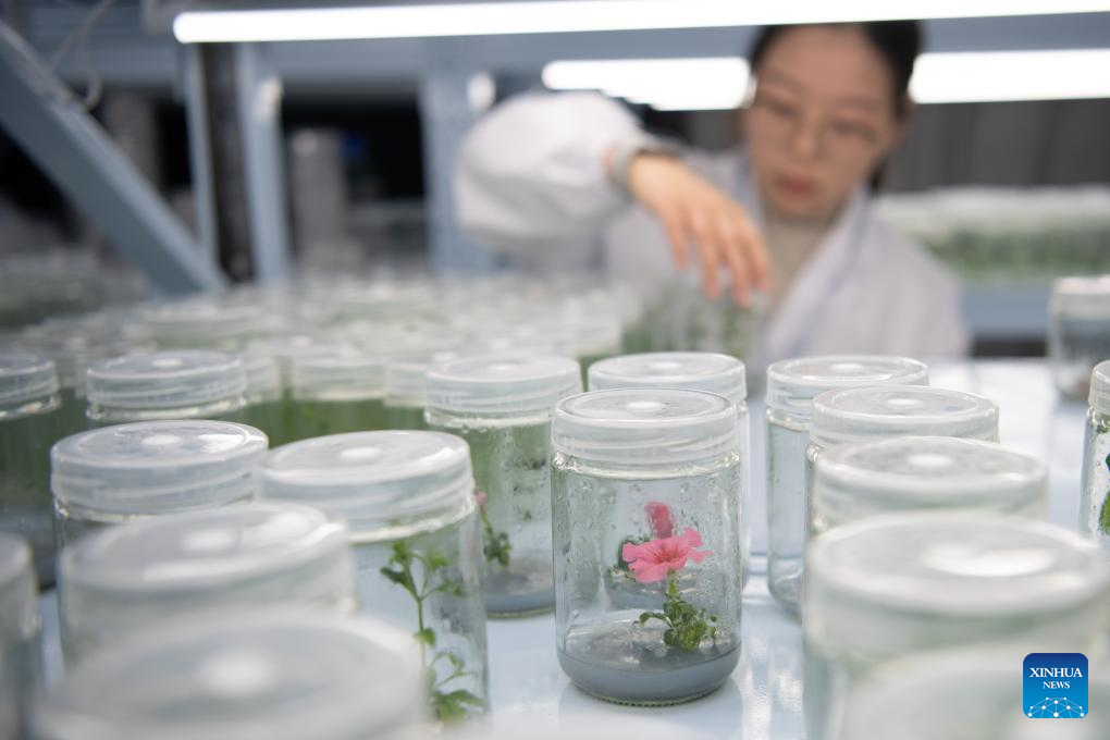 Imagen del 3 de diciembre de 2025 de una investigadora revisando el crecimiento de plántulas en el laboratorio de Magicpen Bio, en Hefei, en la provincia de Anhui, en el este de China. Investigadores chinos han logrado cultivar con éxito una serie de plantas modificadas genéticamente que brillan de forma constante en entornos oscuros. Consiguieron introducir fragmentos de genes de organismos como las luciérnagas en células vegetales, lo que permitió a estas últimas brillar por sí mismas. (Xinhua/Zhang Duan)