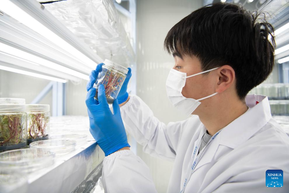 Imagen del 3 de diciembre de 2025 de un investigador revisando el crecimiento de plántulas en el laboratorio de Magicpen Bio, en Hefei, en la provincia de Anhui, en el este de China. Investigadores chinos han logrado cultivar con éxito una serie de plantas modificadas genéticamente que brillan de forma constante en entornos oscuros. Consiguieron introducir fragmentos de genes de organismos como las luciérnagas en células vegetales, lo que permitió a estas últimas brillar por sí mismas. (Xinhua/Zhang Duan)