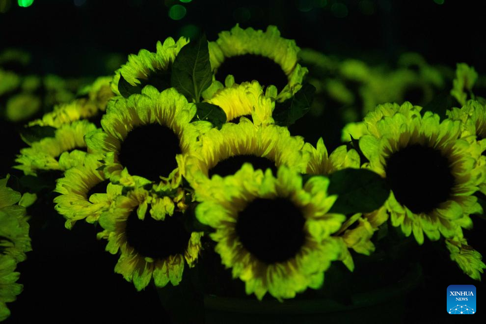 Imagen del 3 de diciembre de 2025 de girasoles bioluminiscentes cultivados por Magicpen Bio, en Hefei, en la provincia de Anhui, en el este de China. Investigadores chinos han logrado cultivar con éxito una serie de plantas modificadas genéticamente que brillan de forma constante en entornos oscuros. Consiguieron introducir fragmentos de genes de organismos como las luciérnagas en células vegetales, lo que permitió a estas últimas brillar por sí mismas. (Xinhua/Zhang Duan)