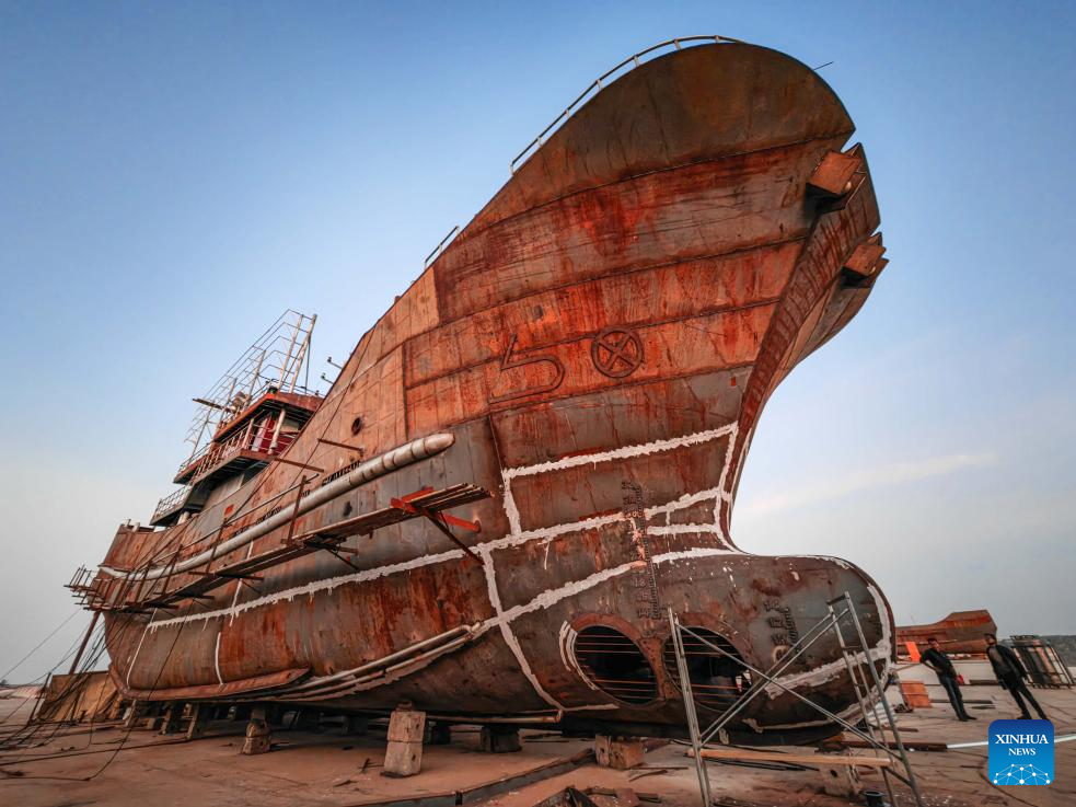 Imagen del 22 de noviembre de 2025 de una vista de una empresa de construcción naval, en la Zona de Desarrollo del Puerto de Jinpai de Lingao, en la provincia de Hainan, en el sur de China. El Puerto de Libre Comercio (FTP, por sus siglas en inglés) de Hainan de China se prepara para operaciones aduaneras especiales en toda la isla, un hito importante en el impulso de apertura de la segunda economía más grande del mundo, a pesar del creciente proteccionismo internacional. Como "campo experimental" del FTP de Hainan, los 13 parques industriales clave dentro del puerto se han convertido en importantes impulsores del crecimiento económico de Hainan. (Xinhua/Pu Xiaoxu)
