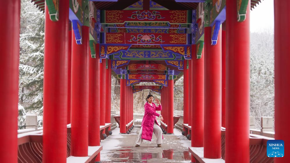BEIJING, 16 diciembre, 2025 (Xinhua) -- Imagen del 13 de diciembre de 2025 de una entusiasta del Tai Chi ejercitándose en un corredor del punto escénico de la montaña Yinghua, en la ciudad de Zouping, en la provincia de Shandong, en el este de China. (Xinhua/Dong Naide)