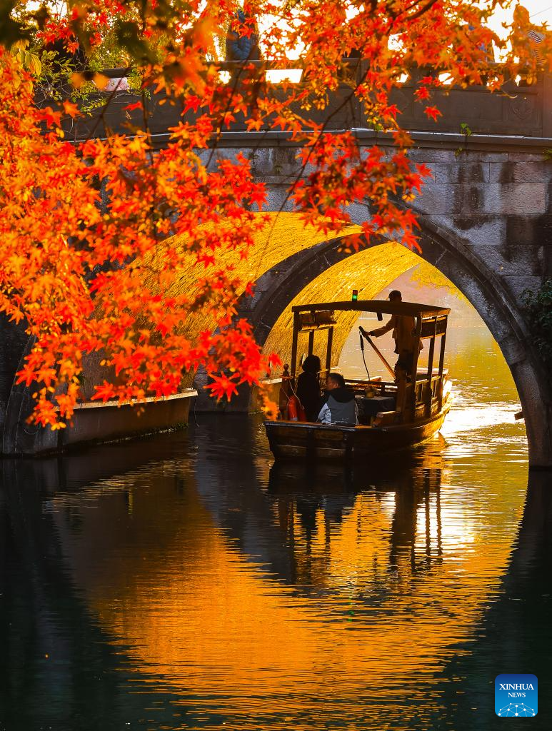 BEIJING, 16 diciembre, 2025 (Xinhua) -- Vista aérea tomada con un dron el 23 de noviembre de 2025 de turistas disfrutando del turismo en un puente de arco cerca del pabellón Wenchang, en la ciudad de Ningbo, en la provincia de Zhejiang, en el este de China. (Xinhua/Hu Xuejun)
