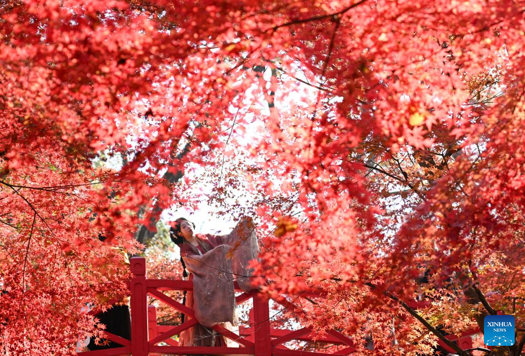 BEIJING, 16 diciembre, 2025 (Xinhua) -- Imagen del 7 de diciembre de 2025 de una turista disfrutado de las hojas de arce en el Jardín Botánico Zhongshan, en Nanjing, en la provincia de Jiangsu, en el este de China. (Xinhua/Yang Suping)