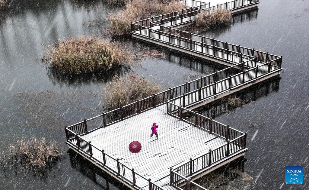 BEIJING, 16 diciembre, 2025 (Xinhua) -- Vista aérea tomada con un dron el 12 de diciembre de 2025 de un turista disfrutando de la nevada en el lago Quyang, en Jiyuan, en la provincia de Henan, en el centro de China. (Xinhua/Miao Qiunao)