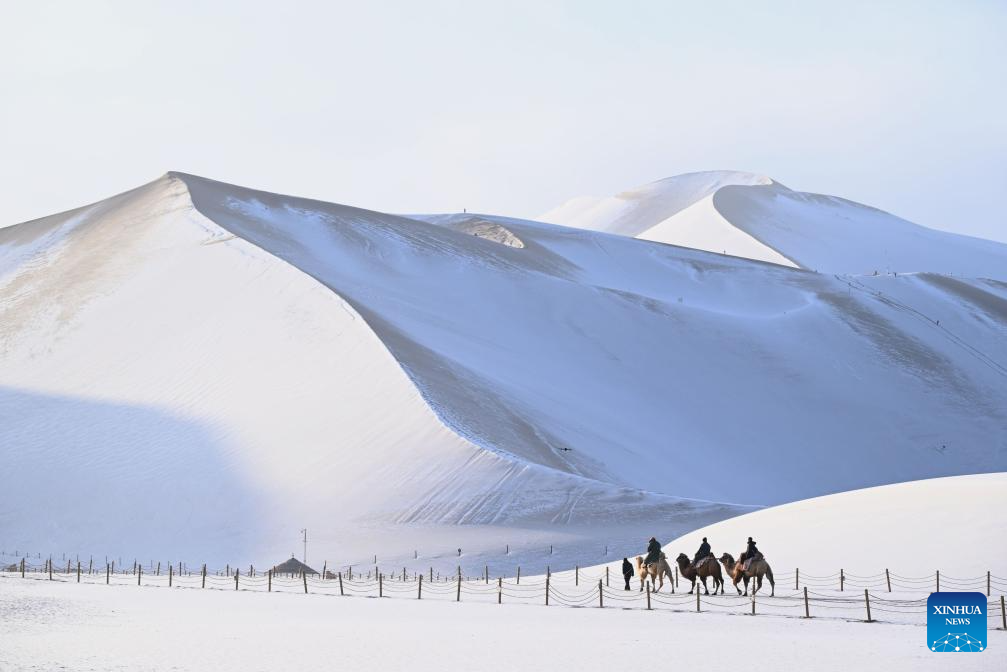 BEIJING, 16 diciembre, 2025 (Xinhua) -- Imagen del 12 de diciembre de 2025 de turistas montando camellos para disfrutar del paisaje nevado en el Area Escénica de la Montaña Mingsha y el Manantial de la Luna Creciente, en la ciudad de Dunhuang, en la provincia de Gansu, en el noroeste de China. (Xinhua/Zhang Xiaoliang)