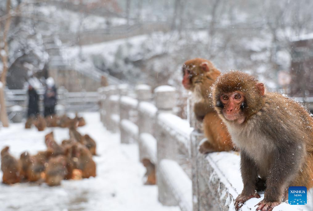 BEIJING, 16 diciembre, 2025 (Xinhua) -- Imagen del 13 de diciembre de 2025 de monos descansando sobre una barandilla en el punto escénico de la montaña Huaguo tras una nevada, en la ciudad de Lianyungang, en la provincia de Jiangsu, en el este de China. (Xinhua/Wang Jianmin)