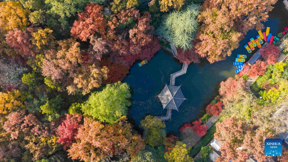 BEIJING, 16 diciembre, 2025 (Xinhua) -- Vista aérea tomada con un dron el 28 de noviembre de 2025 de turistas visitando el parque forestal nacional de Yushan, en la ciudad de Changshu, en la provincia de Jiangsu, en el este de China. (Xinhua/Wang Xuzhong)