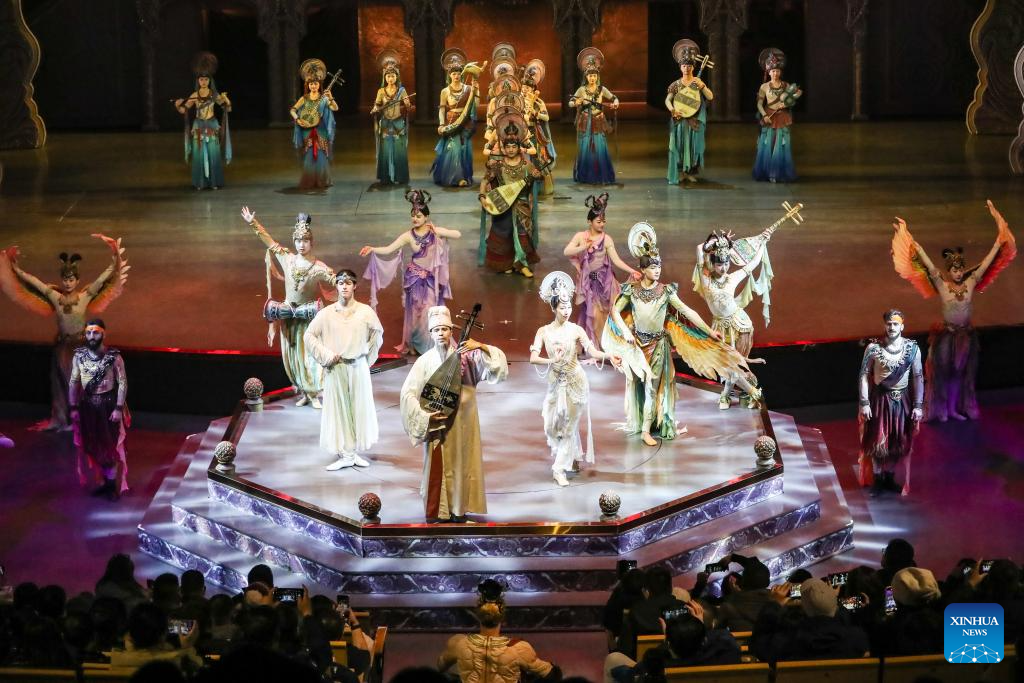 DUNHUANG, 16 diciembre, 2025 (Xinhua) -- Imagen del 15 de diciembre de 2025 del drama de danza inmersivo "El Sonido Antiguo de Dunhuang" llevado a cabo, en Dunhuang, en la provincia de Gansu, en el noroeste de China. Combinando elementos extraídos de los murales y esculturas de Dunhuang, la presentación muestra un escenario cuidadosamente diseñado, una pantalla holográfica y una danza impresionante. (Xinhua/Lang Bingbing)