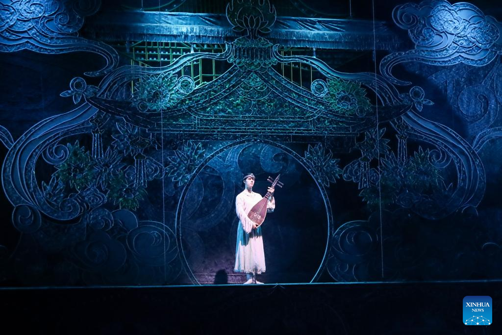 DUNHUANG, 16 diciembre, 2025 (Xinhua) -- Imagen del 15 de diciembre de 2025 del drama de danza inmersivo "El Sonido Antiguo de Dunhuang" llevado a cabo en Dunhuang, en la provincia de Gansu, en el noroeste de China. Combinando elementos extraídos de los murales y esculturas de Dunhuang, la presentación muestra un escenario cuidadosamente diseñado, una pantalla holográfica y una danza impresionante. (Xinhua/Lang Bingbing)