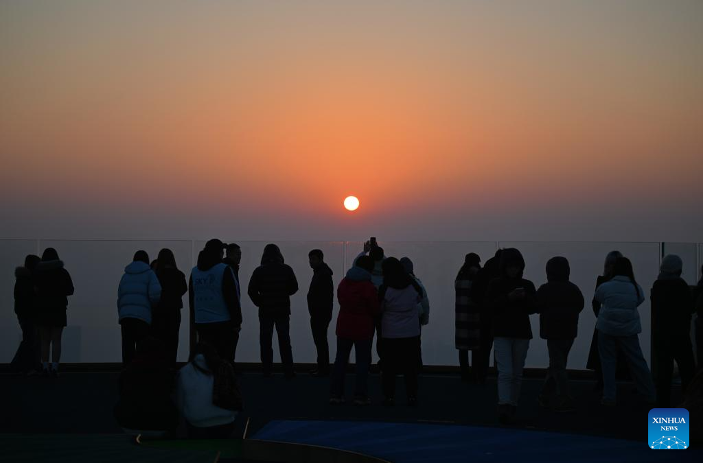 TIANJIN, 21 diciembre, 2025 (Xinhua) -- Imagen del 17 de diciembre de 2025 de visitantes observando el atardecer en la plataforma de observación Jinwan Yunding, en el distrito Heping de Tianjin, en el norte de China. Recientemente, la plataforma de observación Jinwan Yunding, situada en la plaza Jinwan, en el distrito Heping de Tianjin, ha comenzado a funcionar. Los visitantes pueden subir a la azotea, a 300 metros de altura, para contemplar la vista urbana de Tianjin. (Xinhua/Li Ran)