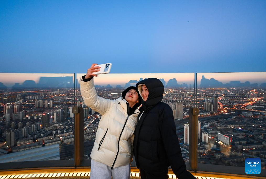 TIANJIN, 21 diciembre, 2025 (Xinhua) -- Imagen del 20 de diciembre de 2025 de visitantes posando para una fotografía en la plataforma de observación Jinwan Yunding, en el distrito Heping de Tianjin, en el norte de China. Recientemente, la plataforma de observación Jinwan Yunding, situada en la plaza Jinwan, en el distrito Heping de Tianjin, ha comenzado a funcionar. Los visitantes pueden subir a la azotea, a 300 metros de altura, para contemplar la vista urbana de Tianjin. (Xinhua/Zhao Zishuo)
