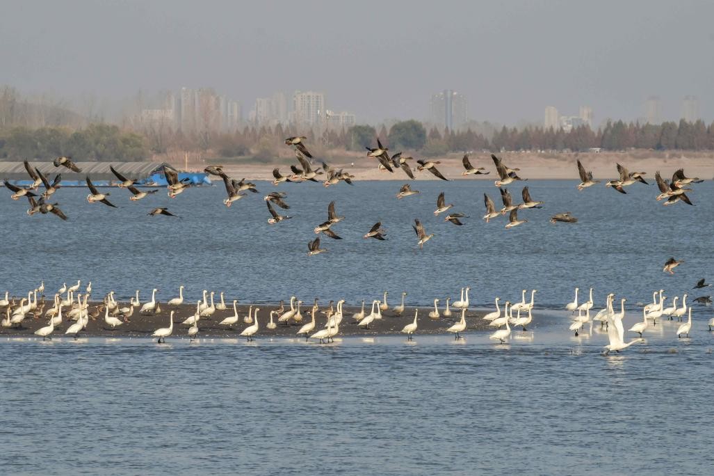| Cisnes migratorios y pagodas gigantes descansan en un islote en el río Yangtze en Tongling, provincia de Anhui, en el este de China, el 6 de diciembre de 2025. (Foto/Chu Zhuchuan) |