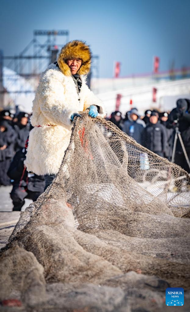 HOHHOT, 12 enero, 2026 (Xinhua) -- Imagen del 10 de enero de 2026 de un pescador sacando una red de la superficie congelada del lago durante el cuarto festival de pesca invernal de Hasuha, en Hohhot, en la región autónoma de Mongolia Interior, en el norte de China. Hohhot ha puesto en marcha más de 300 programas de diversión de invierno desde diciembre de 2025, incluyendo deportes de hielo y nieve, experiencias culturales y consumo de moda para impulsar la economía local. (Xinhua/Xu Ting)
