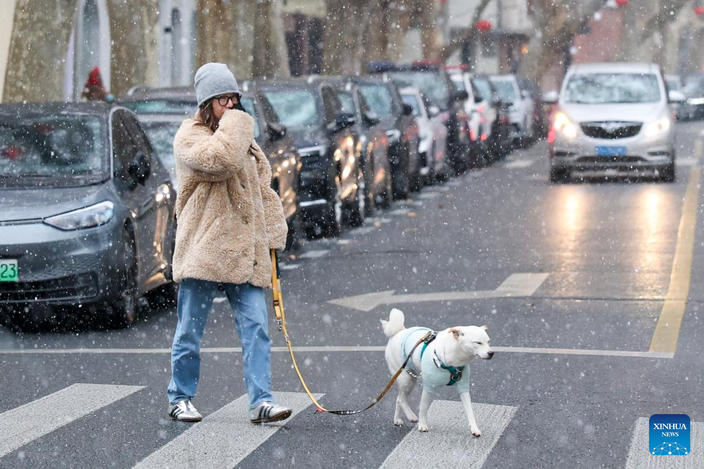 BEIJING, 20 enero, 2026 (Xinhua) -- Una mujer pasea a su perro en medio de la nieve, en el distrito de Xuhui de Shanghai, en el este de China, el 20 de enero de 2026. En relación con las nevadas generalizadas y los descensos de temperatura en varias regiones de China, se han tomado medidas para responder activamente a estas condiciones meteorológicas. (Xinhua/Wang Xiang)