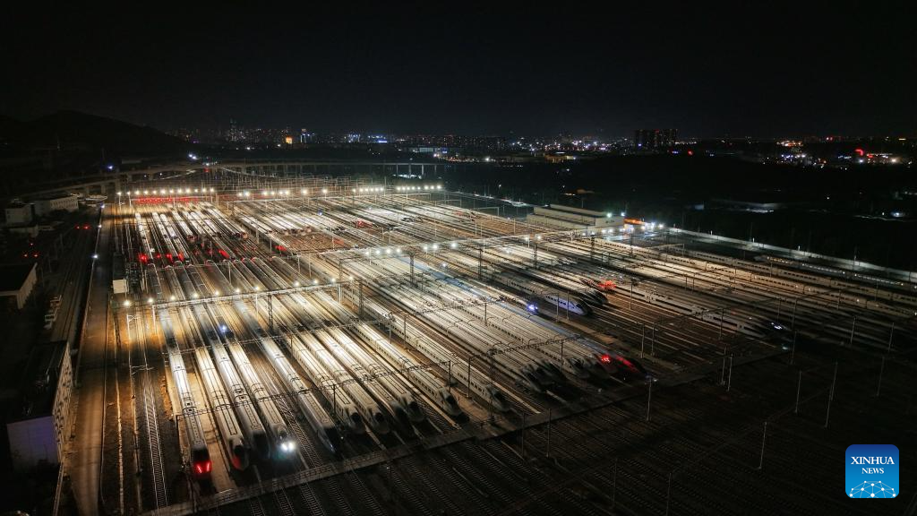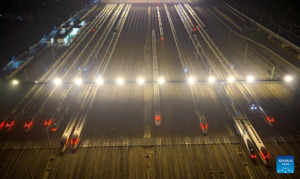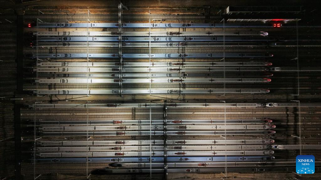 BEIJING, 25 enero, 2026 (Xinhua) -- Imagen tomada con un dron el 25 de enero de 2026 de trenes bala estacionados en un depósito de trenes bala, en la ciudad de Nanjing, en la provincia de Jiangsu, en el este de China. Un nuevo horario de tren tomará efecto en China desde el 26 de enero de 2026. (Xinhua/Yang Suping)