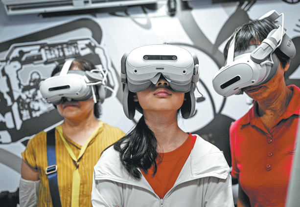 Visitantes disfrutan de una experiencia de viaje interestelar en MR en el centro, 7 de octubre. (Foto Pu Xiuaoxu/ Xinhua)