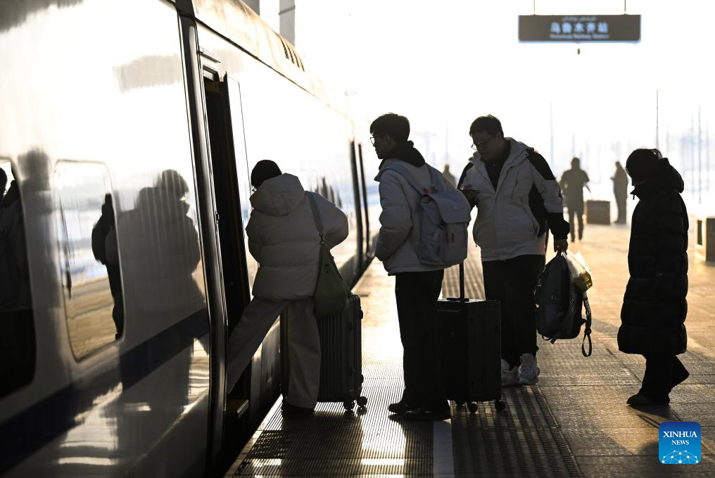 BEIJING, 2 febrero, 2026 (Xinhua) -- Pasajeros esperan para abordar un tren en la Estación de Ferrocarriles de Urumqi, en Urumqi, en la región autónoma uygur de Xinjiang, en el noroeste de China, el 2 de febrero de 2026. China dio comienzo el lunes a la mayor migración anual de su población, 15 días antes del Festival de la Primavera de 2026, tradicional celebración que también es conocida como el Año Nuevo chino. Se prevé que los viajes de pasajeros alcancen un total de 9.500 millones durante este período de movilidad intensa, que este año finalizará el 13 de marzo, cifra que representaría un récord histórico. (Xinhua/Wang Fei)