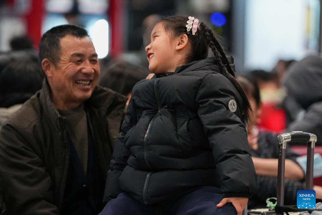 BEIJING, 2 febrero, 2026 (Xinhua) -- Imagen del 1 de febrero de 2026 de Dai Chenxi (d), de cinco años, jugando con su abuelo en la sala de salidas de la Estación de Ferrocarriles del Oeste de Beijing, en Beijing, capital de China. Ella viajará con su familia en el tren número K4069 de regreso a su ciudad natal Gushi, en Henan, en el centro de China para el Festival de la Primavera. China dio comienzo el lunes a la mayor migración anual de su población, 15 días antes del Festival de la Primavera de 2026, tradicional celebración que también es conocida como el Año Nuevo chino. Se prevé que los viajes de pasajeros alcancen un total de 9.500 millones durante este período de movilidad intensa, que este año finalizará el 13 de marzo, cifra que representaría un récord histórico. (Xinhua/Ju Huanzong)
