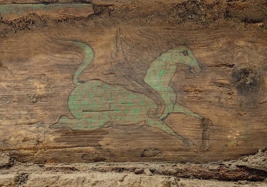 La foto, tomada en un laboratorio modular de arqueología el 1 de febrero de 2026, muestra un "caballo alado" pintado dentro de un ataúd de madera, desenterrado de la tumba M20 del cementerio oriental de Badam, en Turpan, de la región autónoma uygur de Xinjiang, en el noroeste de China. (Xinhua/Li He)