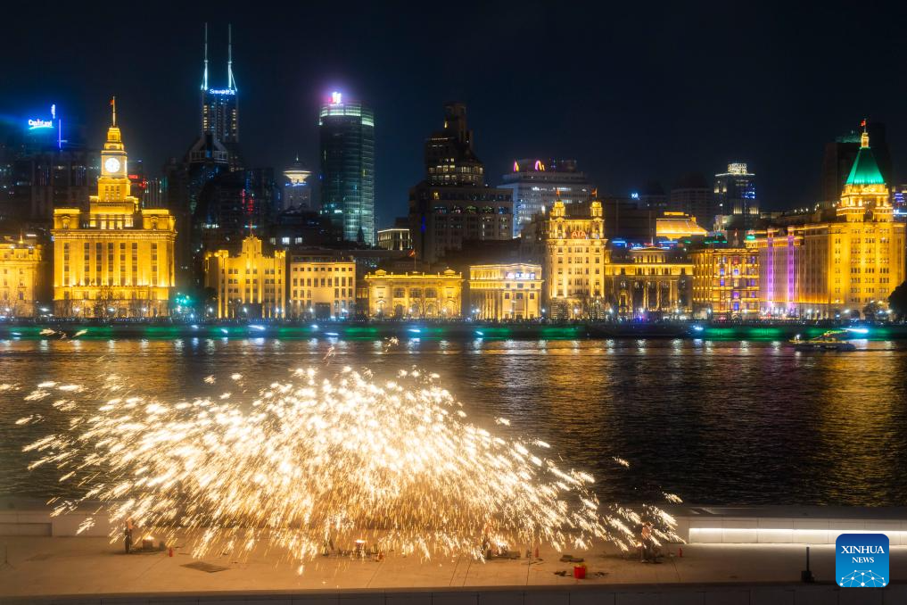 SHANGHAI, 8 febrero, 2026 (Xinhua) -- Un espectáculo de fuegos artificiales de hierro fundido se lleva a cabo junto al río Huangpu, en Pudong, en Shanghai, en el este de China, el 8 de febrero de 2026. (Xinhua/Wang Xiang)