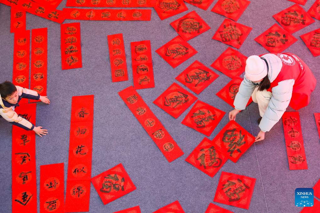 BEIJING, 8 febrero, 2026 (Xinhua) -- Un voluntario estudiante (d) clasifica trabajos de caligrafía en Hai'an, en la provincia de Jiangsu, en el este de China, el 8 de febrero de 2026. Varias actividades extracurriculares están disponibles para los estudiantes a lo largo de China durante las vacaciones de invierno. (Xinhua/Gu Binbin)