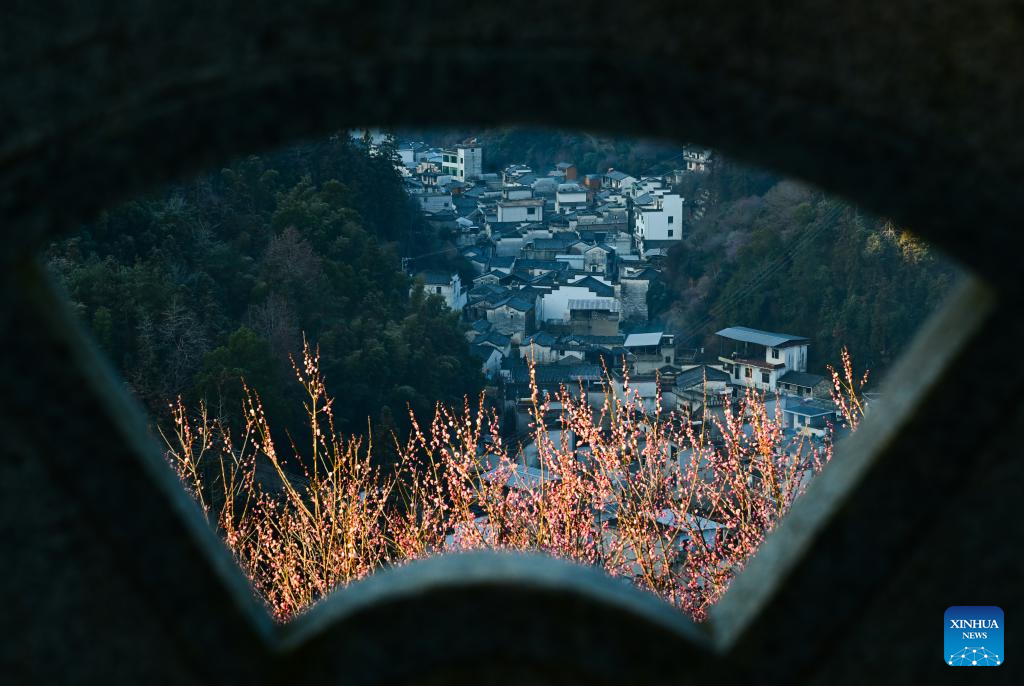 HUANGSHAN, 9 febrero, 2026 (Xinhua) -- Imagen tomada el 9 de febrero de 2026 del paisaje entre los ciruelos en flor, en la aldea de Maihuayu, en el distrito de Shexian, en la provincia de Anhui, en el este de China. (Xinhua/Zhou Mu)