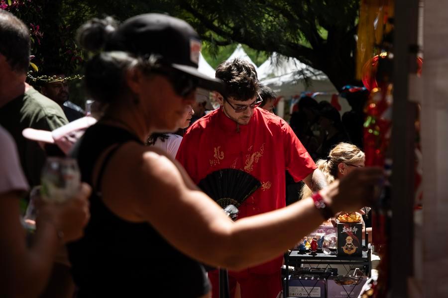 Imagen del 8 de febrero de 2026 deLeandro Vitullo (d) observando objetos exhibidos en un estand durante las celebraciones del Año Nuevo chino en la plaza Parques Naciones Argentinos, en la ciudad de Buenos Aires, capital de Argentina. (Xinhua/Martín Zabala)