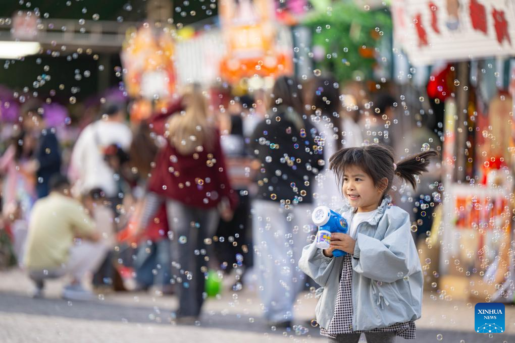 Una niña se divierte en un mercado de la Fiesta de la Primavera, en Macao, en el sur de China, el 15 de febrero de 2026. (Xinhua/Cheong Kam Ka)