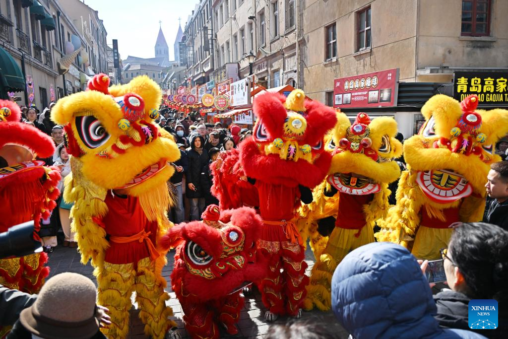 Imagen del 17 de febrero de 2026 de visitantes observando una presentación de la danza del león, en Qingdao, en la provincia de Shandong, en el este de China. Durante las vacaciones de la Fiesta de la Primavera, las personas en Qingdao participaron en varios eventos para experimentar el ambiente festivo. (Xinhua/Li Ziheng)