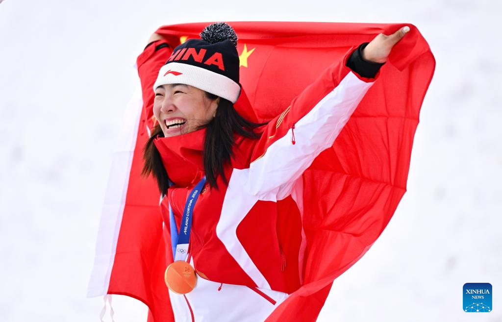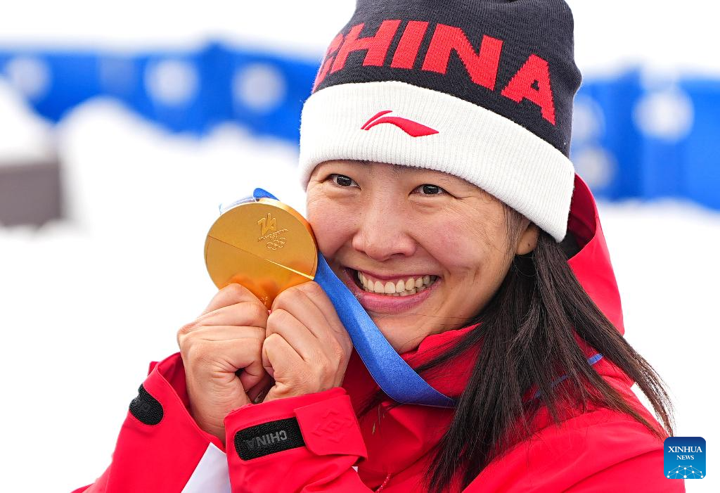 LIVIGNO, 18 febrero, 2026 (Xinhua) -- La medallista de oro, Xu Mengtao, de China, muestra su medalla durante la ceremonia de premiación de aerials femenino de esquí acrobático en los Juegos Olímpicos de Invierno Milán-Cortina 2026, en Livigno, Italia, el 18 de febrero de 2026. (Xinhua/Wu Huiwo)