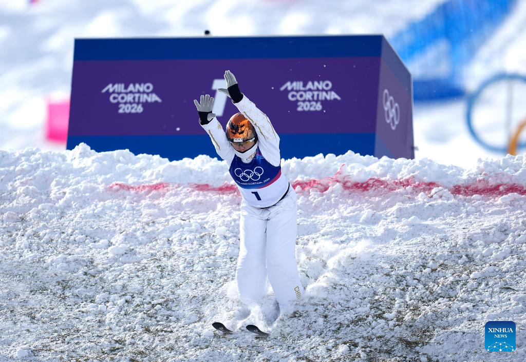 LIVIGNO, 18 febrero, 2026 (Xinhua) -- Xu Mengtao, de China, festeja al término de la final 2 de aerials femenino de esquí acrobático en los Juegos Olímpicos de Invierno Milán-Cortina 2026, en Livigno, Italia, el 18 de febrero de 2026. (Xinhua/Wu Huiwo)