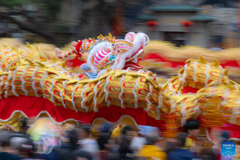MACAO, 17 febrero, 2026 (Xinhua) -- Artistas realizan una presentación de la danza del dragón en celebración por la Fiesta de la Primavera, en Macao, en el sur de China, el 17 de febrero de 2026. (Xinhua/Cheong Kam Ka)