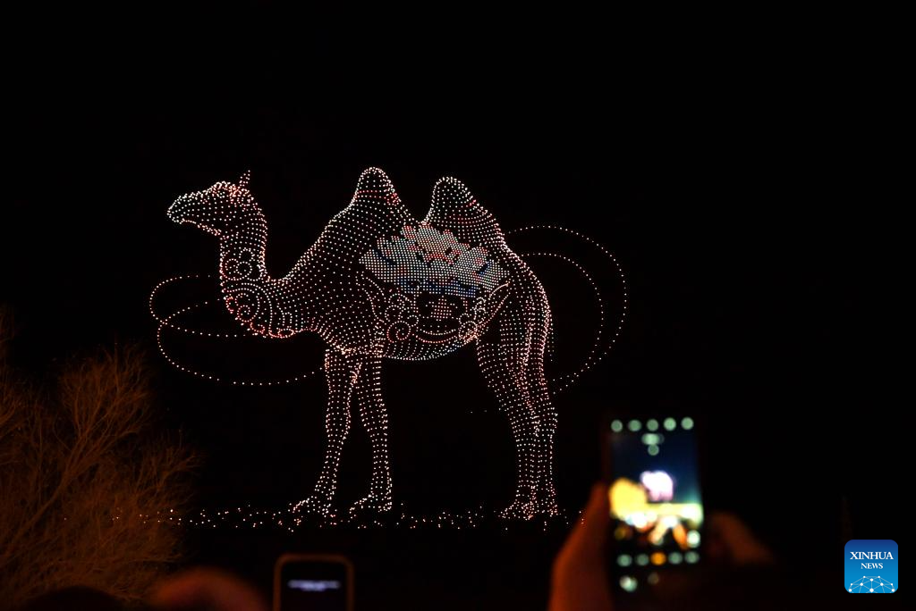 Imagen del 22 de febrero de 2026 de personas observando un espectáculo de drones en un punto escénico, en Dunhuang, en la provincia de Gansu, en el noroeste de China. (Xinhua/Zhang Xiaoliang)