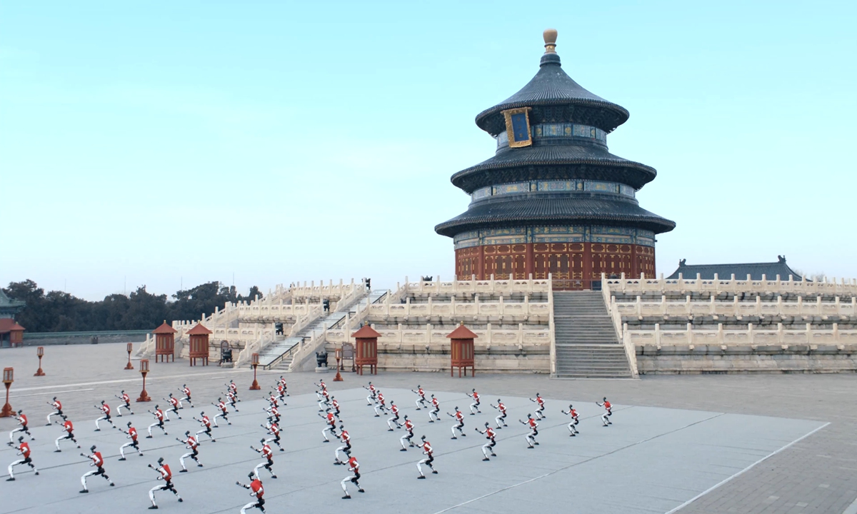 Los robots humanoides G1 de Unitree realizaron una demostración de artes marciales sincronizada frente al Salón de la Oración por las Buenas Cosechas en el Templo del Cielo en Beijing. Foto: Captura de pantalla del videoclip de Unitree.