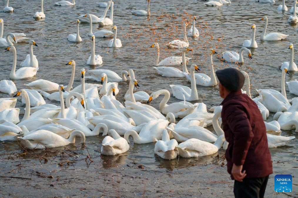 Imagen del 25 de febrero de 2026 de un hombre alimentando a cisnes junto al río Daling, en la ciudad de Chaoyang, en la provincia de Liaoning, en el noreste de China. Bandadas de cisnes migran aquí desde principios del invierno, atrayendo a muchos turistas. (Xinhua/Hu Jingwen)