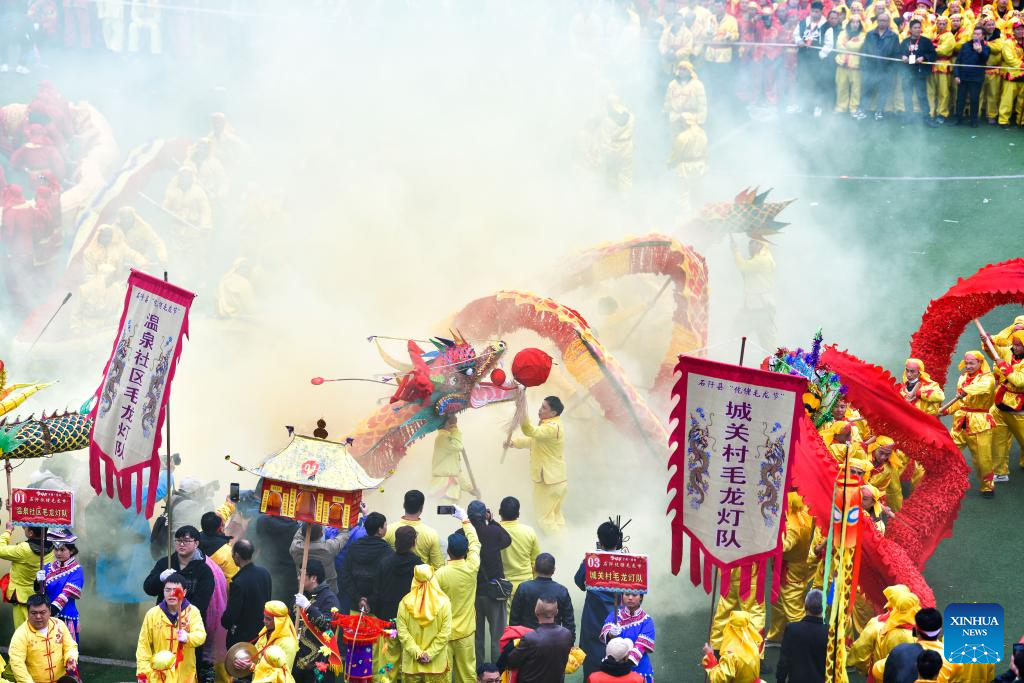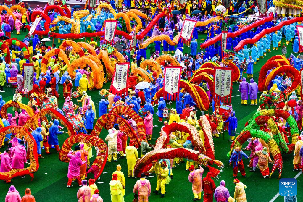Vista aérea tomada con un dron de la ceremonia de inauguración del "Festival Malong" del grupo étnico yilao, en el distrito de Shiqian, en la provincia de Guizhou, en el suroeste de China, el 27 de febrero de 2026. El Festival Maolong, una actividad folclórica del pueblo del grupo étnico yilao para marcar la Fiesta de la Primavera y el festival de las linternas, fue enlistado como patrimonio cultural inmaterial nacional en 2006. (Xinhua/Yang Wenbin)
