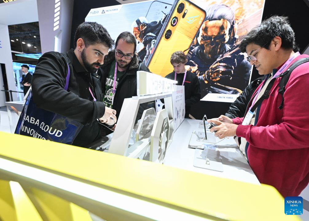 Personas prueban un dispositivo para gaming de Nubia de China durante el Congreso Mundial de Móviles (MWC, por sus siglas en inglés) 2026, en Barcelona, España, el 5 de marzo de 2026. El MWC 2026 concluyó aquí el jueves. (Xinhua/Cheng Min)