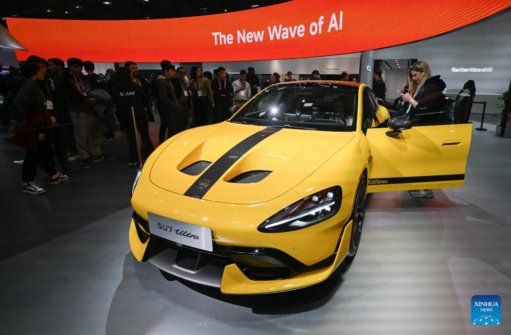Personas observan un vehículo exhibido en el estand de Xiaomi durante el Congreso Mundial de Móviles (MWC, por sus siglas en inglés) 2026, en Barcelona, España, el 5 de marzo de 2026. El MWC 2026 concluyó aquí el jueves. (Xinhua/Cheng Min)
