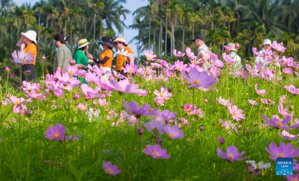 Imagen del 7 de marzo de 2026 de turistas observando flores, en la aldea de Nanqiang del poblado de Boao, en la provincia de Hainan, en el sur de China. (Xinhua/Meng Zhongde)