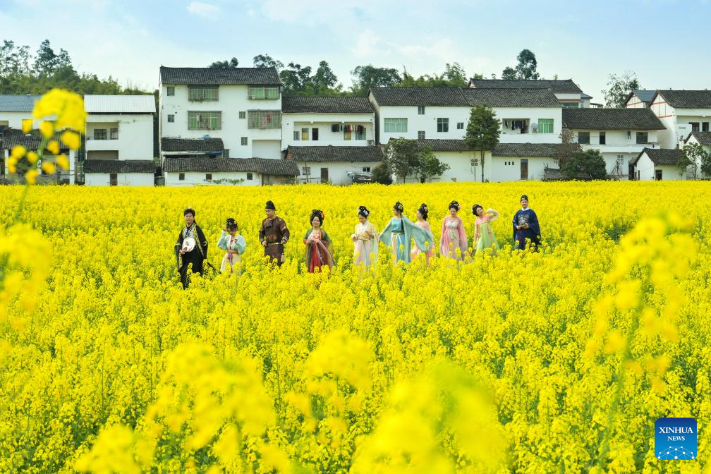 Imagen del 5 de marzo de 2026 de turistas portando vestimentas tradicionales mientras caminan entre campos de flores de colza, en la ciudad de Guang'an, en la provincia de Sichuan, suroeste de China. (Xinhua/Zhang Guosheng)