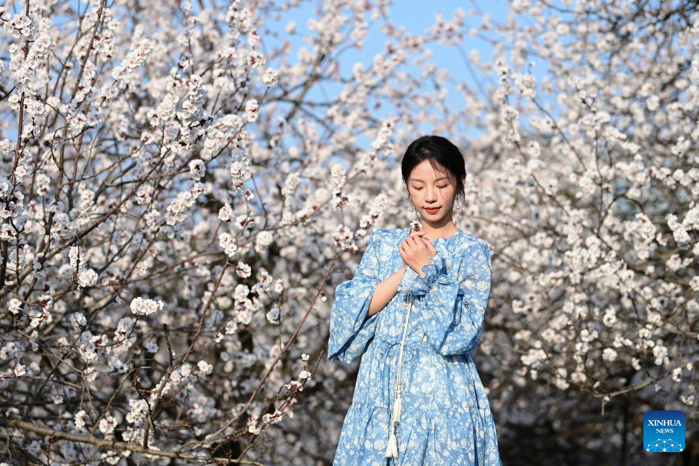 Una turista posa para fotografías con árboles en flor en el Parque del Patrimonio Nacional del Palacio Daming, en Xi'an, en la provincia de Shaanxi, en el noroeste de China, el 9 de marzo de 2026. Las flores retoñan mientras la temperatura incrementa en China. (Xinhua/Zou Jingyi)