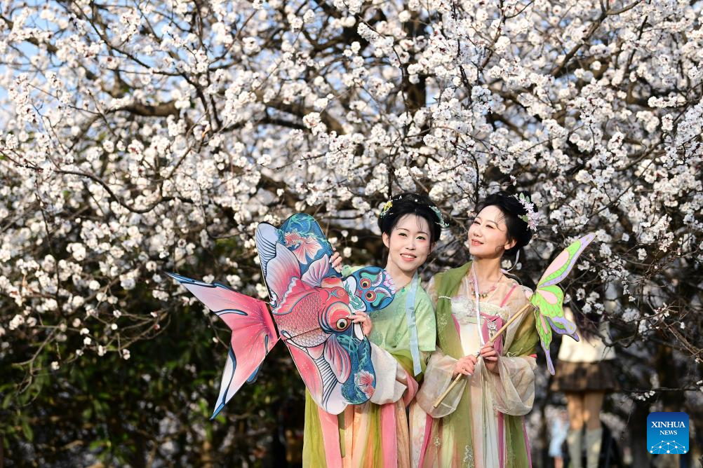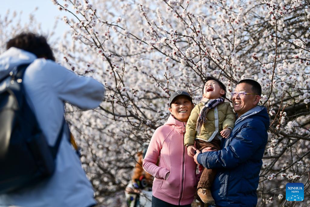 Turistas posan para fotografías con árboles en flor en el Parque del Patrimonio Nacional del Palacio Daming, en Xi'an, en la provincia de Shaanxi, en el noroeste de China, el 9 de marzo de 2026. Las flores retoñan mientras la temperatura incrementa en China. (Xinhua/Zou Jingyi)